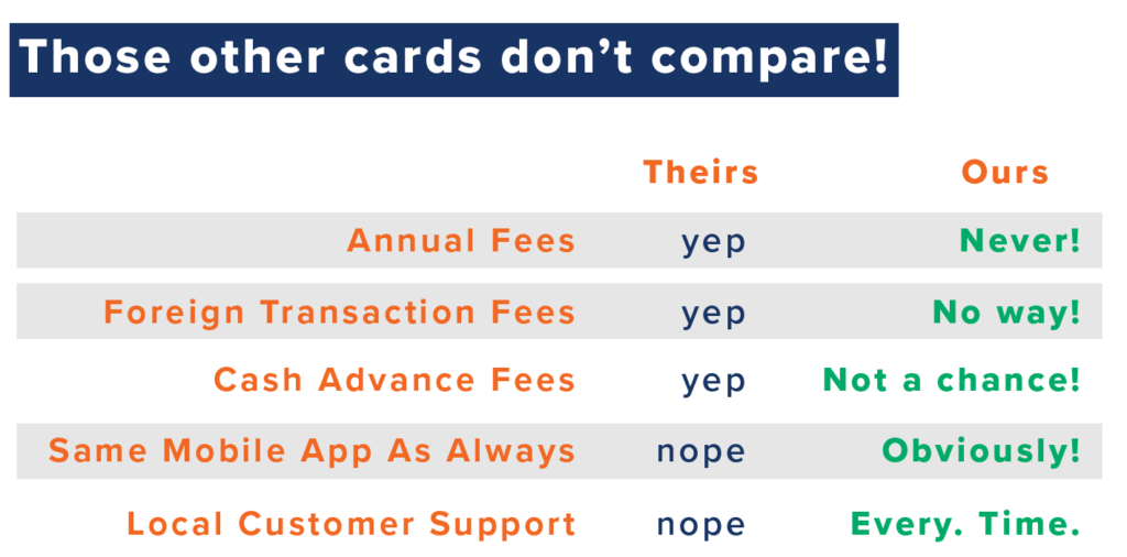 Those other cards don’t compare: No annual fees, no foreign transaction fees, no cash advance fees, use the same great mobile app, and local customer support.