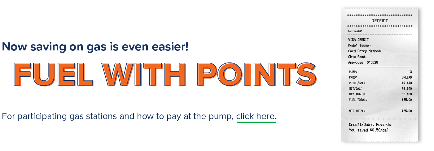 2,000 points = 50 cents off per gallon up to 20 gallons