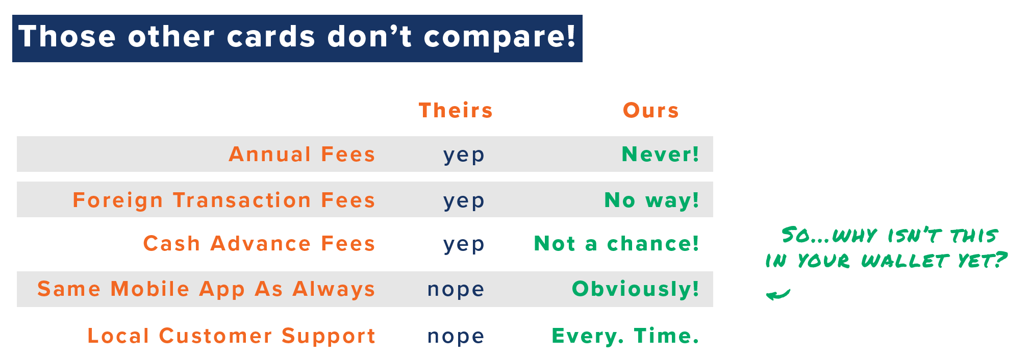 Those other cards don’t compare: No annual fees, no foreign transaction fees, no cash advance fees, use the same great mobile app, and local customer support. So, why isn’t it in your wallet yet?