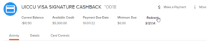 Screenshot of digital banking app, showing the “Redeem” button.