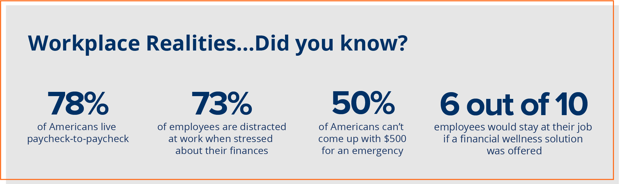 Workplace realities. Did you know: 78% of Americans live paycheck to paycheck. 73% of employees are distracted at work when stressed about their finances. 50% of Americans can’t come up with $500 for an emergency. 6 out of 10 employees would stay at their job if a financial wellness solution was offered.